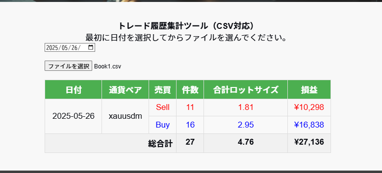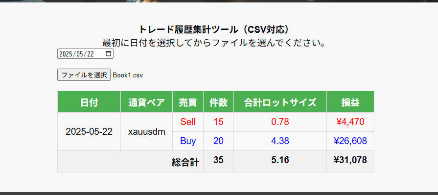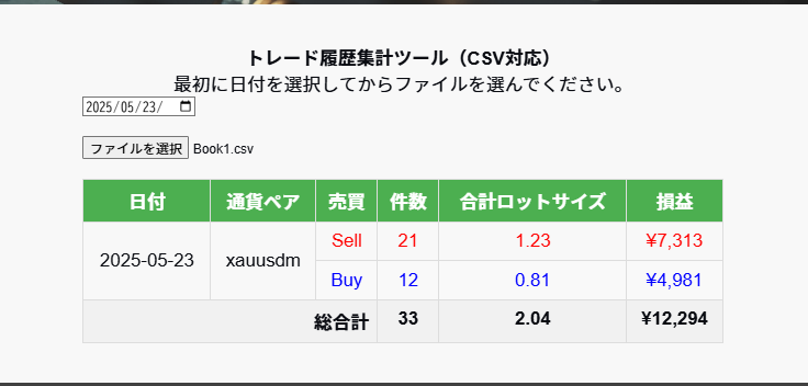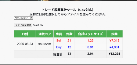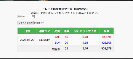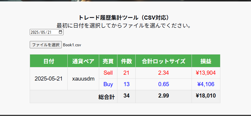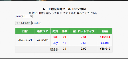 このEAは、小さな利益をコツコツ稼いで行くイメージですので、約定数が多いため、それを集計したものです。