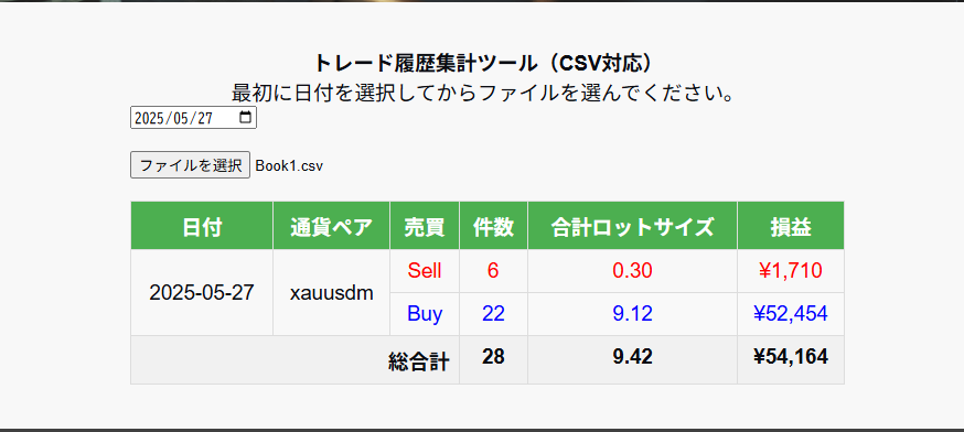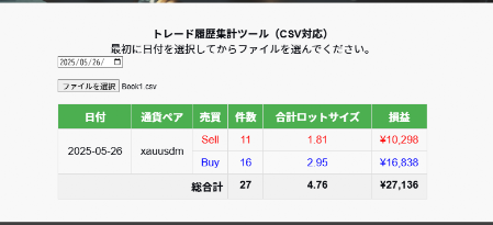 1週間運用した結果を、MT4チャートのターミナルのタブにある「口座履歴」からダウンロードできる「詳細レポート」を使って集計した結果を示します。