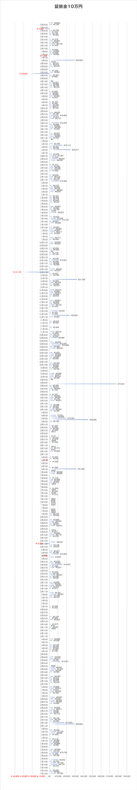これまで一度も破綻せず、安定して運用しています。但し、為替介入や大きな経済指標が予想される際には長期に渡って稼働を停止しています。サンプルとし、10万円と100万円の証拠金で1年間運用した実績を表示しておきます。10万円の方は2通貨ペアで運用しています。