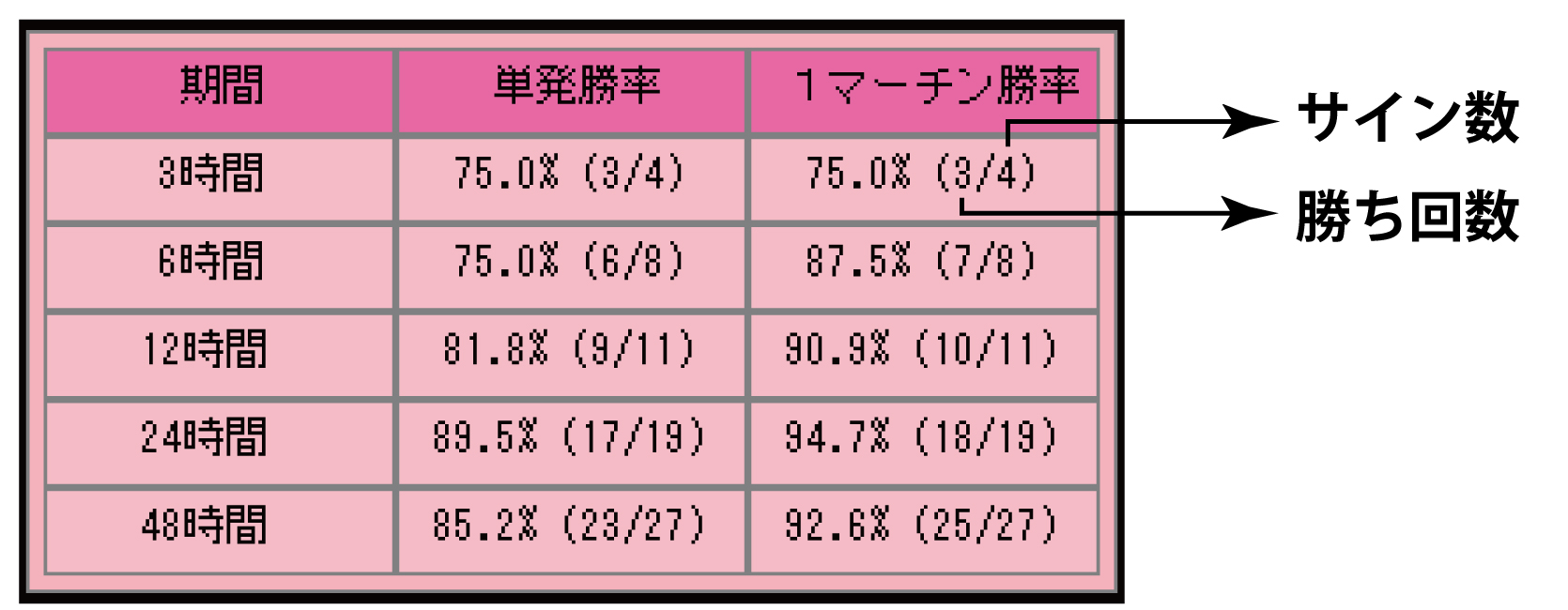 サイン | 勝ち回数 | サイン数 | 勝率 | 利益 |