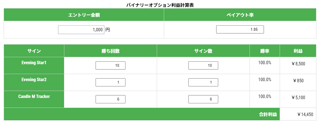 1回1,000円のエントリーで、サインに従いエントリーしていたら、直近3時間の間に14,450円の利益になっていたことがわかります。
