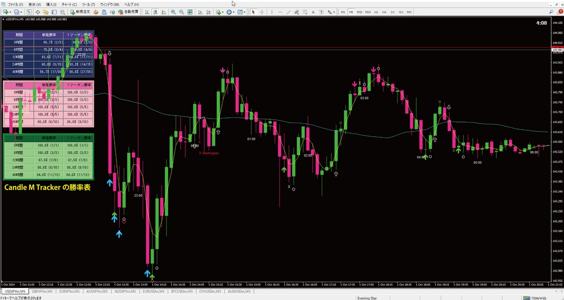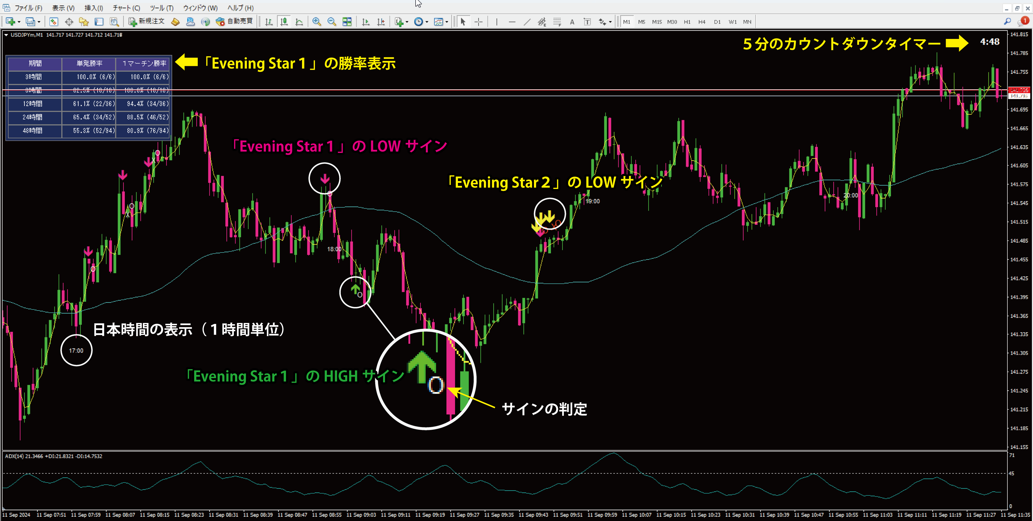 2種類のインジケーターのうち、「Evening Star1」インジケーターの方で勝率表示をしています。