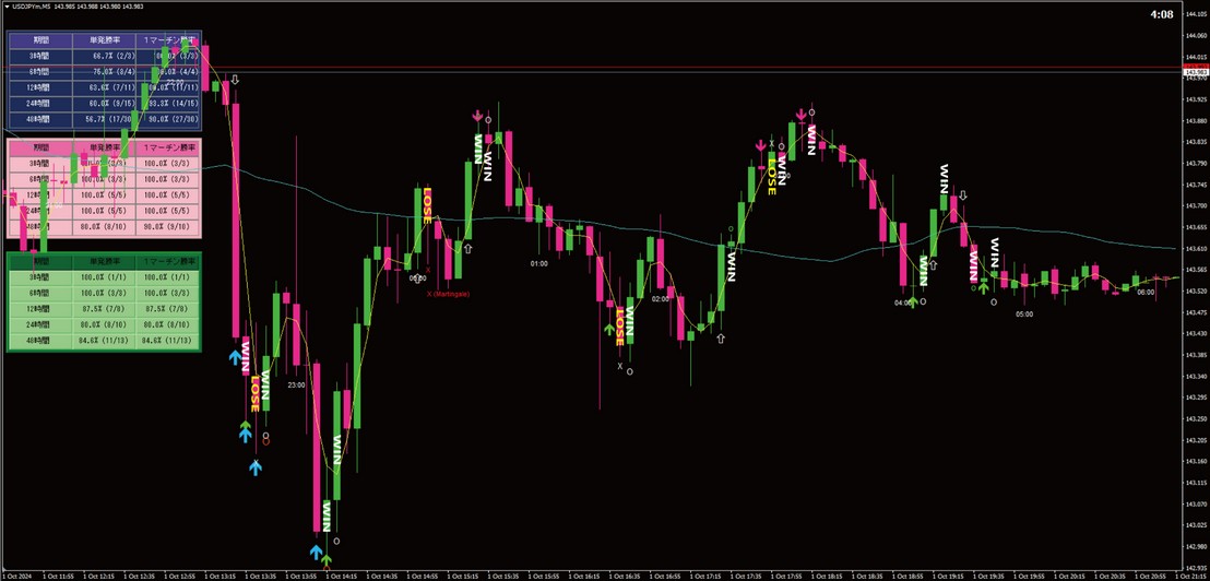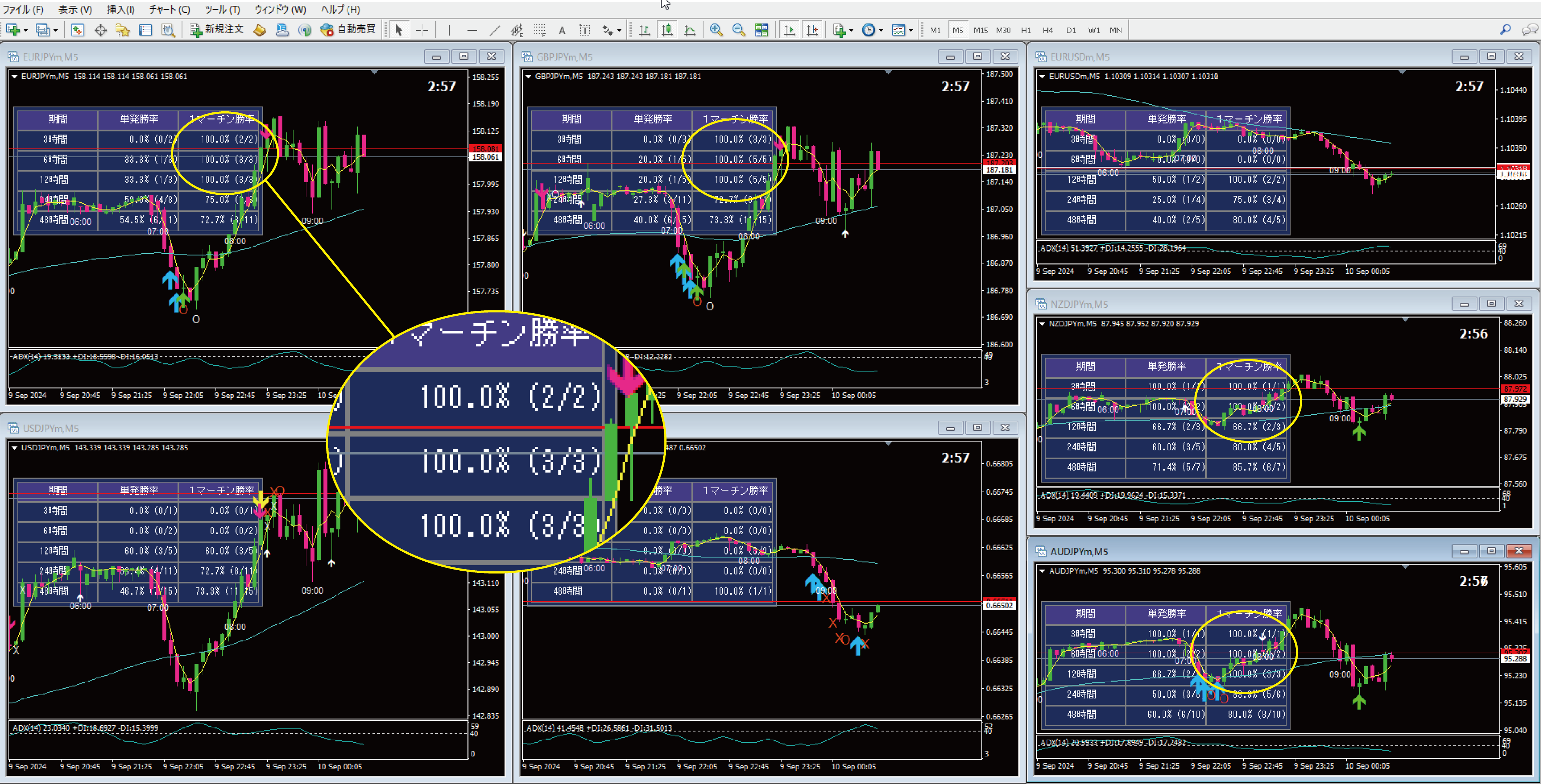 これは基本的な操作となります。但し、左上に表示されている勝率表の「3時間」もしくは「6時間」の1マーチンの勝率が100%となっているチャートでのみ実行します。