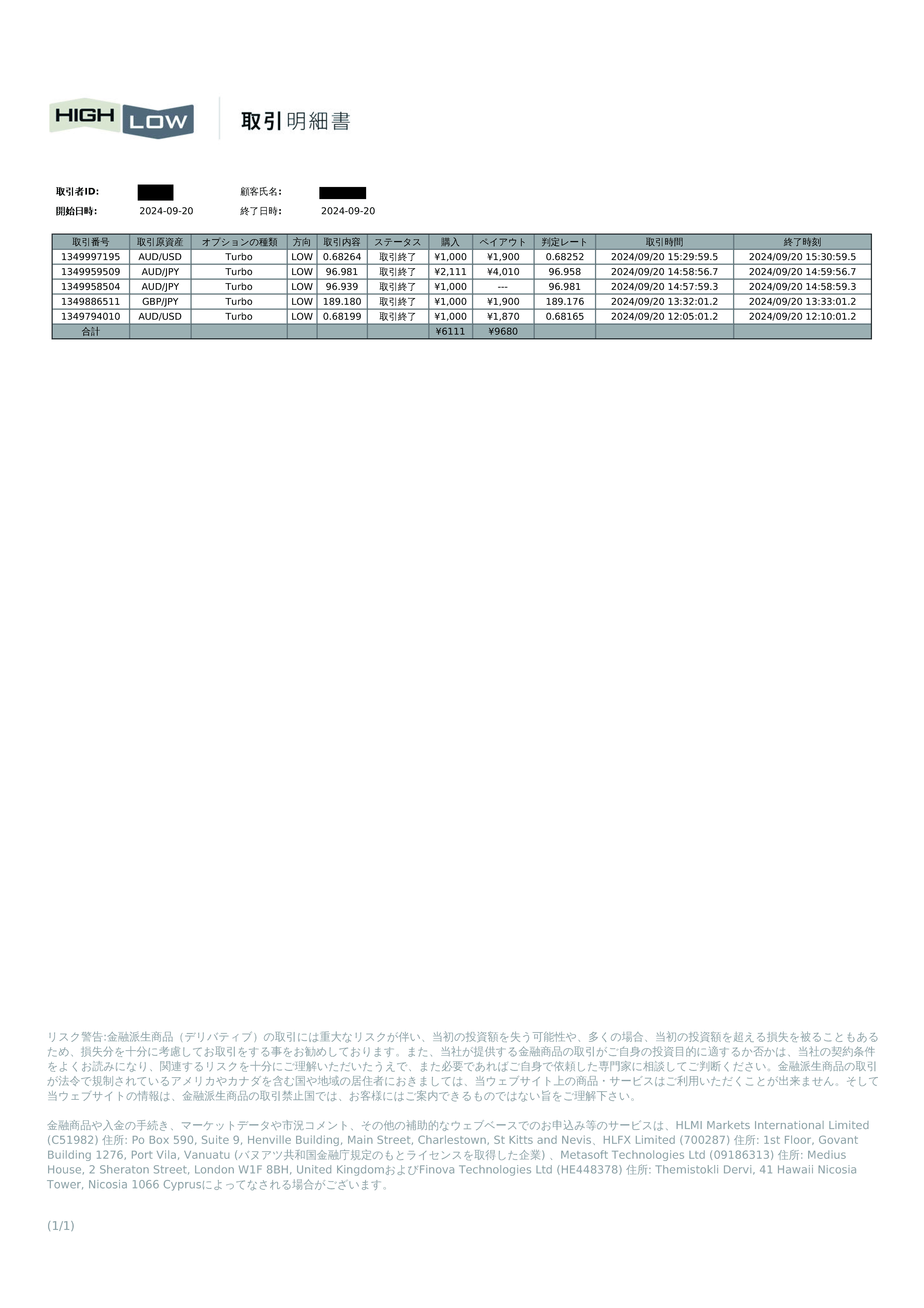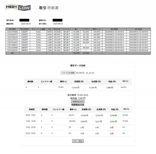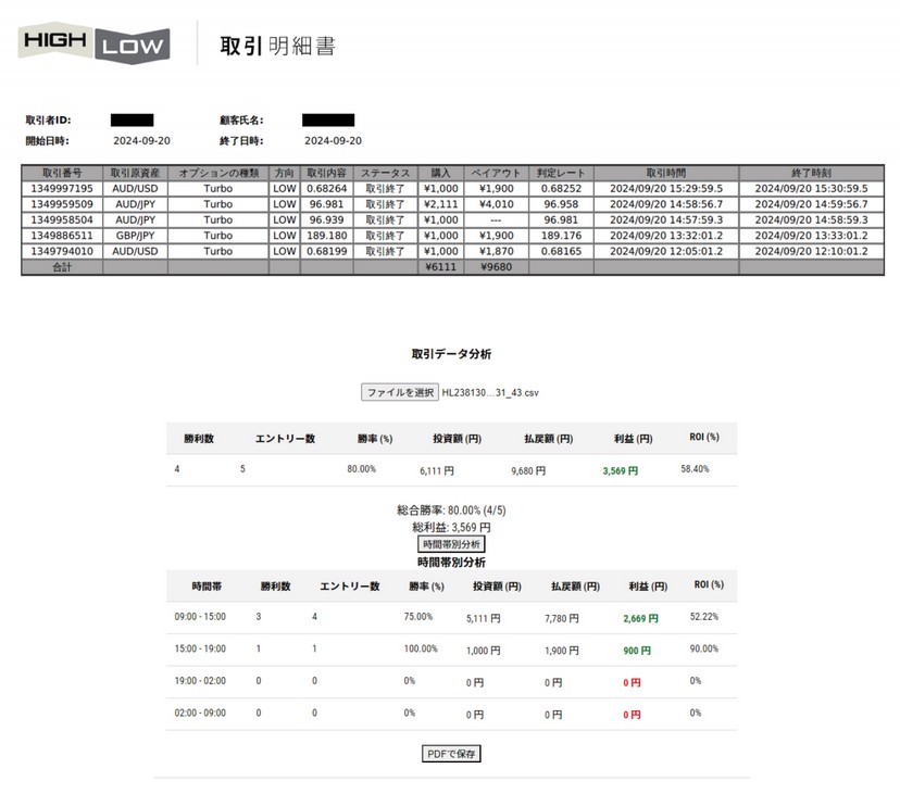 動画で表示した勝率計算表とHIGHLOWの取引履歴は、以下の通りです。