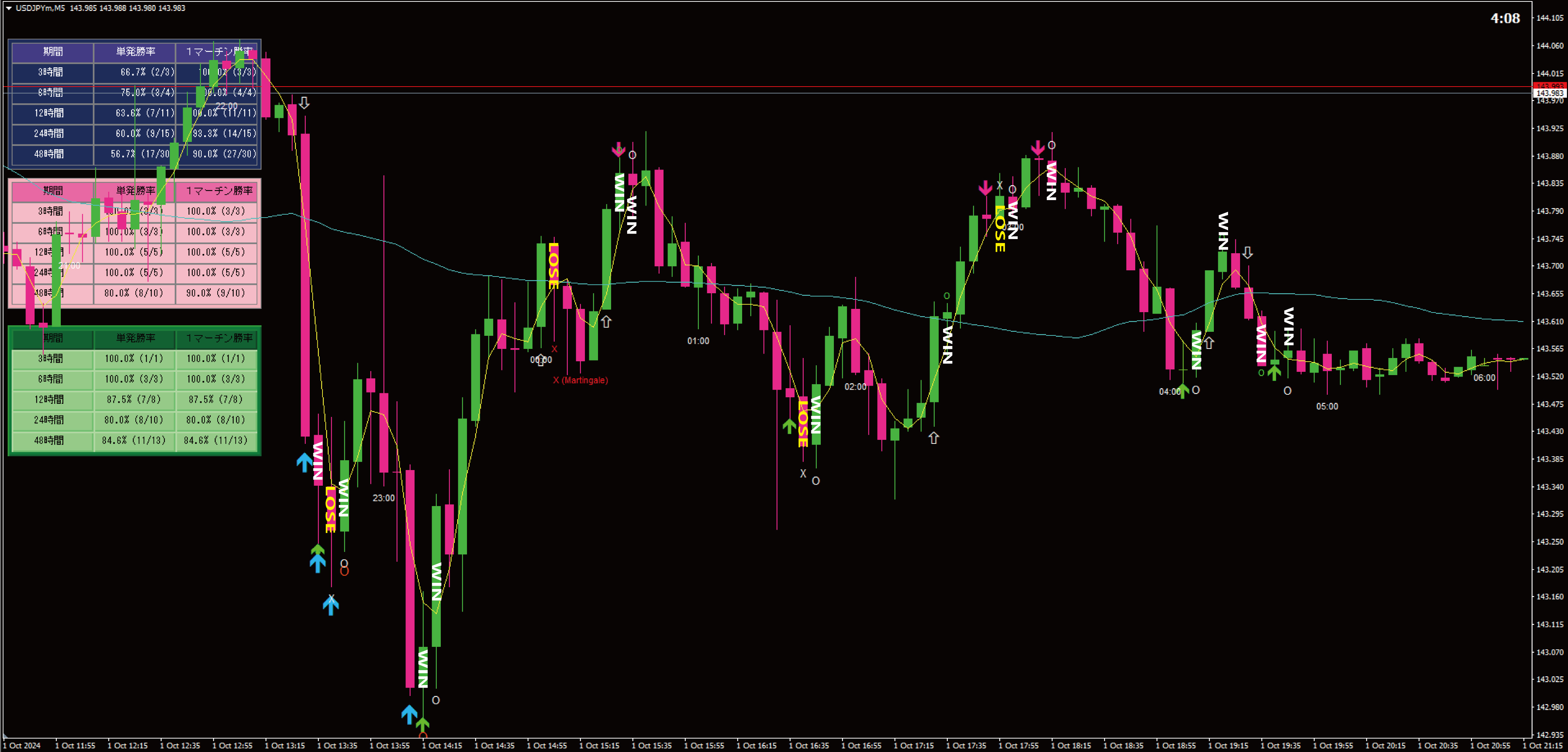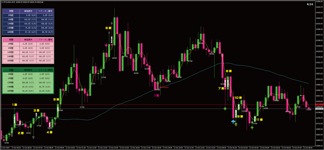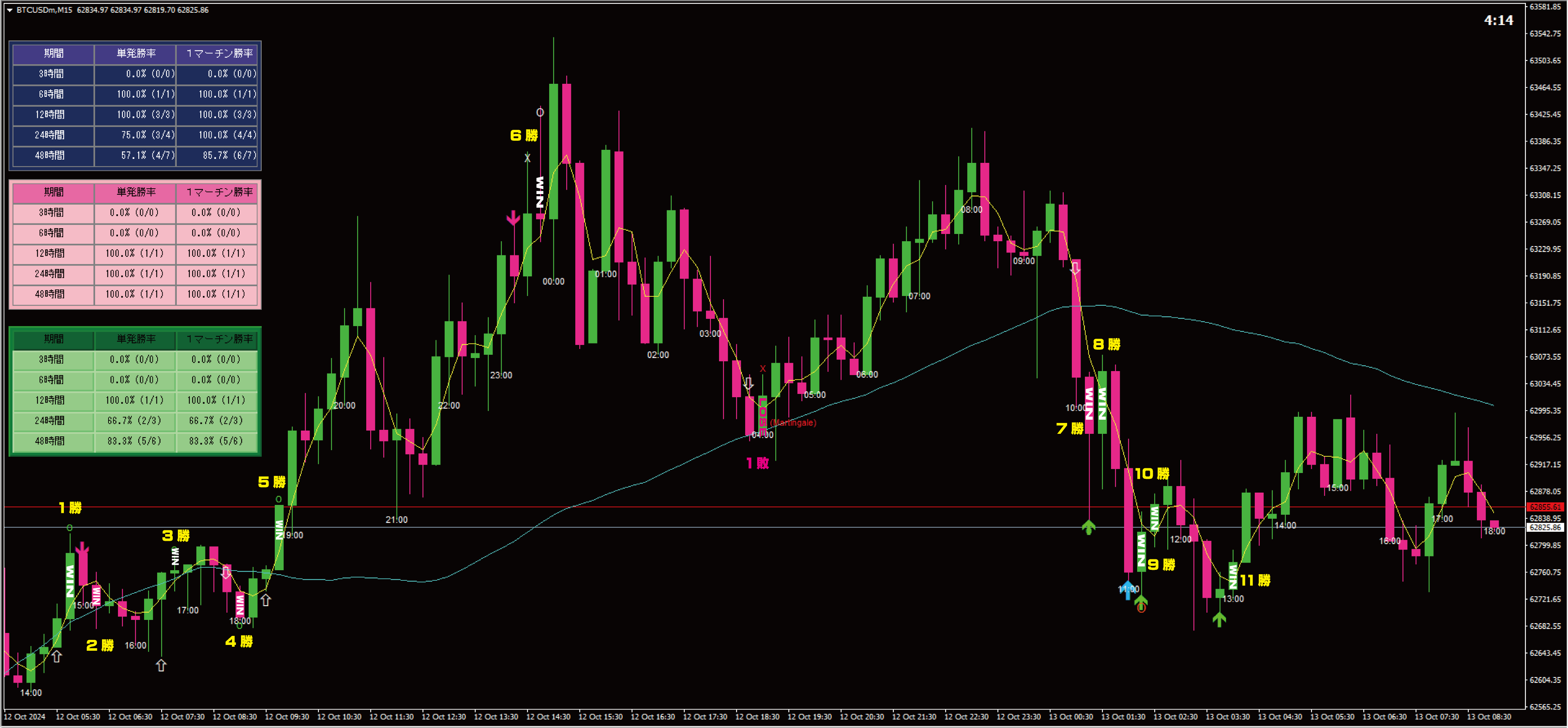 下の画像は15分足のチャート上に表示させた2024年10月12日(土)14:00時~10月13日(日)18:00時までのサイン結果です。