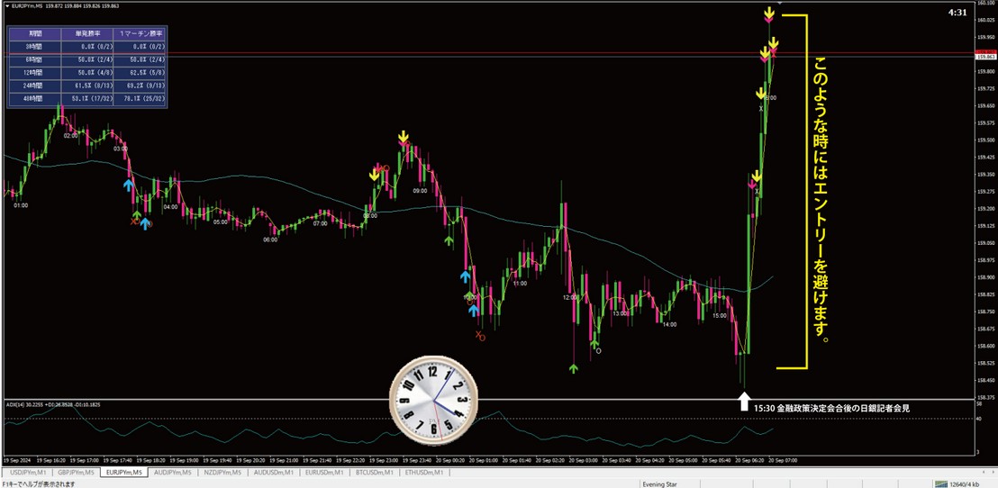 下の例は、ある日のエントリー記録ですが、1マーチンを挟んで4連勝した最後の時間帯(15時29分)を境に、大きなトレンドが発生し、サインが一つも当たっていません。この日は、正午に日銀が政策金利を0.25%に据え置くことを全会一致で決め、15時30分から記者会見が行われました。このタイミングで大きく動いたわけです。このような時にはエントリーしないようにして下さい。インジケーターのサインは正しく表示されません。サンプルとしてEUR/JPYのチャートを表示しておきます。