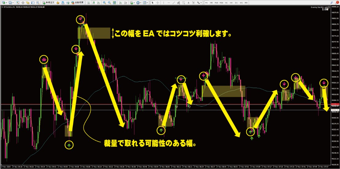 裁量でトレードするのであれば、「Evening Star1」を導入するだけで可能ですし、自動売買で運用するのであれば、それも可能です。