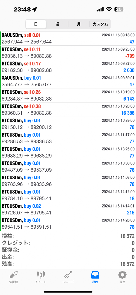実際、11月15日(金)にGOLD、BTCUSDの2通貨ペアに絞って、それぞれ初期ロット数を最小の0.01ロットで運用した結果も示しておきます。