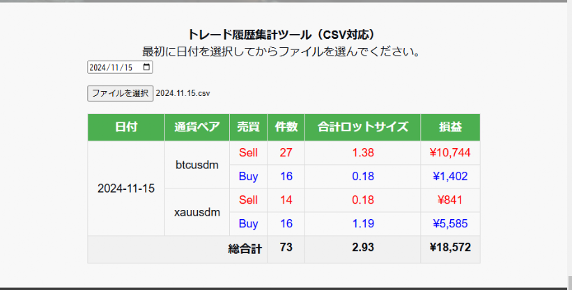 約定ー利確を繰り返しますので、口座履歴の行が相当数行きます。トータルの結果だけでは不明確ですので、MT4チャートから得られる口座履歴のhtmlデータを使って、自動で集計するプログラムを作りました。